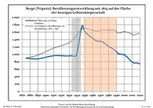 Development of Population since 1875 within the Current Boundaries (Blue Line: Population; Dotted Line: Comparison to Population Development of Brandenburg state; Grey Background: Time of Nazi rule; Red Background: Time of Communist rule)