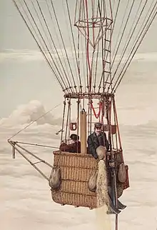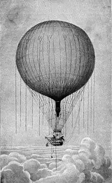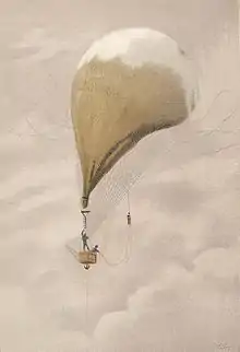 The first balloon flight with the aim of making meteorological observations was undertaken on 30 November 1784 by the American medical doctor John Jeffries together with the professional balloonist Jean-Pierre Blanchard.[5] Some of the first systematic investigations into the upper atmosphere was performed between 1862 and 1866 by the English meteorologist and important pioneer aerologist James Glaisher. On 28 balloon flights, he measured the temperature, air pressure, humidity and the wind speed up to an altitude of almost 9000 meters.[6][7] As his instruments were not sufficiently protected from solar radiation, and as he placed them inside the basket, his temperature measurements were particularly high and affected by errors. In the following years, most scientific balloon flights were made by French scientists such as Camille Flammarion, Gaston Tissandier and Wilfrid de Fonvielle. However, the investigation of the upper atmosphere remained isolated endeavors of individual researchers until the 1890s.[8]