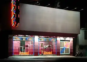 Flamboyant betel nut stands decorated with flashing neon signs are a common sight on many major roads in Taiwan.[5] Their primary target consumers are mostly truckers and other working-class people.[6] Some shop owners started to hire girls dressed in sexy outfits to grab customers' attention, and rivals followed suit.[5]