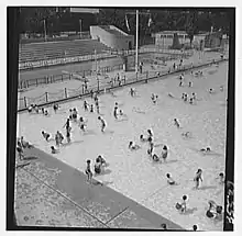In September 1936, work started on converting the main pool to winter use, with workers temporarily draining the pool and adding basketball, handball, shuffleboard, tennis, and volleyball facilities.[41] The original bathhouse was destroyed by fire on August 17, 1937,[47][48][49] and the pool was closed for the rest of the season.[50] Park commissioner Moses's letter to La Guardia, addressed three days later, advocated for the total replacement of the bathhouse.[41] The pool area was reopened for the 1938 season,[51] with a temporary one-story structure that housed the showers. The current one-story bathhouse was opened on May 27, 1939.[41][49] By 1941, the other athletic facilities in the larger southwestern portion of the park were nearly complete.[52]