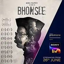 Bhonsle premiered in the 'A Window on Asian Cinema' section of the 2018 Busan International Film Festival and was also screened in the non-competitive India Story section at the MAMI Film Festival, the 2018 Dharamshala International Film Festival, the 2019 International Film Festival Rotterdam, the Bengaluru International Film Festival and the Singapore South Asian film festival.[4][5][6][7][8][9] It won the Best Screenplay and Best Director Award at the Asian Film Festival Barcelona.[10] It was released on SonyLIV on 26 June 2020.[11] Manoj Bajpayee won the National Film Award for Best Actor at the 67th National Film Awards.