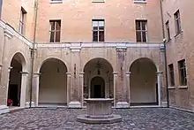 The Palazzo Gambalunga is Renaissance in its architectural style, influenced by Sebastiano Serlio and Giacomo Barozzi da Vignola.[1][2] It is centred on an inner courtyard,[1] which since 1928 has featured an eighteenth-century well of Istrian stone.[3]