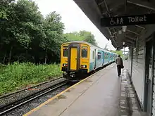 The station has a booking office, shelter and toilet facilities.[14] Each side of the island platform can receive six carriages.[15] The station is staffed at all times during opening hours, and has platform CCTV. Each platform has open-air seating. There is a payphone, next to the ticket office, on platform 1.[16] The station provides a "Park and Ride" service. There are a further 198 car parking spaces,[17] which are free to use for travellers, with lighting columns and CCTV to meet Merseytravel's Travelsafe requirements. Construction of the new car park was completed in 2010. There is no access to the platform for passengers with wheelchairs or prams, as access is by staircase only. On 3 August 2015, a new Bike & Go shelter opened at the station.[18] This provides secure cycle storage for 28 cycles.[14]