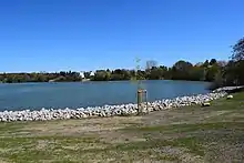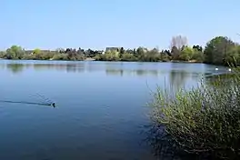 Biesdorfer Baggersee lies in a largely built-up area. A large filter system for rainwater is located a few meters west of its bank.[1] A 1,400 m (4,600 ft) long path runs around the quarry pond, which has several access points to the lake. The shore is overgrown with reeds, trees, and other vegetation on most parts of the lake. Only in the north is the shore area protected from entering by a fence. In the south of the lake, there are two separate sandy beaches, which are not approved for swimming. Several wooden loungers were installed at the lake and a volleyball court was created. The species of fish commonly found in the lake are carp, pike and roach.