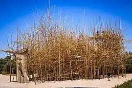 Big Bambu: 5000 arms to hold you, constructed in the sculpture garden of the Israel Museum in Jerusalem in 2014, is 16 meters (52.5 feet) high and covers an area of over 700 square meters (7,500 square feet). Visitors are invited to climb on the framework of 10,000 bamboo poles bound by rope, which forms a labyrinth of winding paths and offers panoramic views of the Jerusalem cityscape.[15]