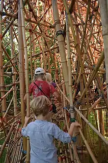 Big Bambú is made of thousands of bamboo poles, lashed together to form a complex structure through which visitors walk on elevated bamboo paths even as a crew continues to build a new part of the structure.[6][7]