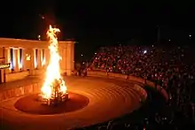 In 2012, the Big Game Bonfire Rally was moved to Edwards Stadium and the bonfire was cancelled due to a scheduling conflict with a Bob Dylan concert. Due to TV contracts, the Pac-12 Conference rescheduled the Big Game from its traditional season-ending slot to October 20, and the Greek Theatre was already booked for the Bob Dylan concert. This was the first time the bonfire had not been held since 1892.[26] The bonfire portion of the rally was cancelled again in 2015 due to the ongoing drought.[28] In 2016, the Fiat Lux torch was added as a symbol of light, with, "For the flames of the past, spirit of the present, and light of the future" engraved on it. In 2018, the big game was rescheduled due to the unhealthy air quality caused by the Camp Fire. All fire/pyrotechnical elements were cut from the rally. The UC Rally Committee immediately began preparations to re-invent the traditional wood burning structure, as they did not want the fire to extinguish like it had almost 30 years earlier at Stanford. In November 2019, a new sheet metal bonfire structure was unveiled.