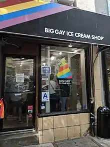 After two years of operating a roving truck, Quint and Petroff opened their first store – the Big Gay Ice Cream Shop, in New York's East Village.[1] Approximately a year later, they opened a second location in the West Village. A pop-up store opened in the Ace Hotel in Los Angeles in late 2014.[7] A Philadelphia location opened in 2015 at the corner of South and South Broad Streets.[8]