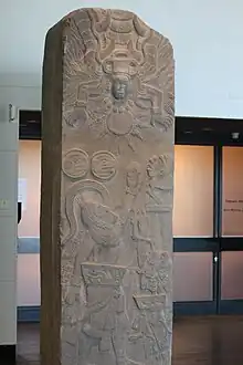 Monument 21 is a basalt boulder in a sugarcane field. The boulder has an artificially flattened upper surface bearing a bas-relief sculpture. The carved face has a 35° slope and measures 11 by 13 feet (3.4 by 4.0 m). The sculpture depicts three main figures. The central figure is the largest and faces towards a second figure seated on a throne. The third figure is behind the central figure, it is smaller and holds a hand puppet. The scene is filled out with twisting vines that sprout cocoa pods bearing human faces. Other details of the monument include birds, snakes and a butterfly with a human head. Monument 21 has been dated to the Classic period.[5] Monument 21 is located east of Mound 2, in the centre of Group B.[35] The decoration on the skirt of one of the figures may be the face of the central Mexican deity Xipe Totec.[13]