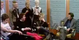 Grundy then turned his attention to the female members of the band's entourage, known as The Bromley Contingent appearing with them and which included Siouxsie Sioux. He asked, "What about you girls, behind? Are you worried, or are you just enjoying yourself?" To which Sioux responded, "enjoying myself". Grundy responded "Are you?" to which she and Simone Thomas chorused "Yeah." Grundy responded "Ah, that's what I thought you were doing." That prompted a large exhalation from a band member. Sioux said, "I've always wanted to meet you", to which Grundy responded by saying, "Did you really? We'll meet afterwards, shall we?"[7] Interpreting this as a sexual comment, Jones began openly insulting Grundy, calling him a "dirty sod" and a "dirty old man." Grundy asked Jones to "say something outrageous", a challenge that Jones met by calling Grundy a "dirty bastard" and a "dirty fucker".[7] Grundy responded, "What a clever boy!" and Jones added "What a fucking rotter!" As the show ended and the credits rolled, Grundy mouthed, "Oh shit" as the band began dancing to the closing theme.[7]