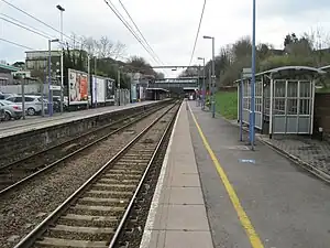 There was a goods yard on the 'down' (eastbound) side of the running lines to the north-west of the station, including a goods shed, cattle pens and a crane. There was a signal box on the 'up' side to the north-west of the station.[1] Goods traffic ceased on 15 June 1967 and the goods shed was demolished soon after.[1] The Shenfield to Southend Victoria line was originally electrified using 1.5 kV DC overhead line electrification (OLE) on 31 December 1956. This was changed to 6.25 kV AC in November 1960 and to 25 kV AC on 25 January 1979.[1]