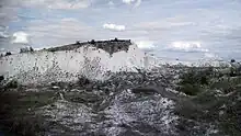 Surveying work was done in 1938–1938 to determine if there were useful mineral reserves in the area.[9] Eventually, chalk deposits were discovered near Bilohorivka in 1946. The mining of that resource would become the basis of the village's economy, and construction of processing plants began.[7] Starting in 1952, mining began, and the deposits became the main source of raw materials for the Lysychansk Soda Plant. In 1954, a cable car track was set up to connect the quarry and the soda plant, at a length of 16.5 kilometres (10.3 mi).[9] Bilohorivka received urban-type settlement status in 1958.[7][6]