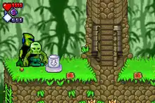Matoran Adventures is a side-scrolling platform game[4] with puzzle elements.[5] The player can choose from three difficulty levels (Easy, Medium, and Hard).[2] The game utilizes a character-swapping mechanic similar to The Lost Vikings (1993).[5][6] As needed, the player can swap between Matoran and Turaga to advance past obstacles. The Matoran character can jump and throw discs to combat enemies, while the Turaga character can break obstacles using their elemental power and activate switches.[7] The Turaga character cannot jump as high as the Matoran.[8] The game features six levels and three boss encounters.[7] The Matoran character's disc is upgraded as the game progresses.[4] Pieces of masks are scattered throughout each level. By gathering all of the pieces of a particular mask, they gain the ability to play as a different Matoran character.[8] One Matoran character, Kongu, is available from the start; the other five Matoran characters must be unlocked.[2]