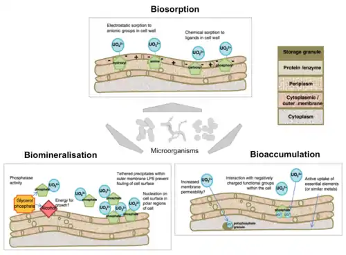 The set of strategies that comprise biosorption, bioaccumulation and biomineralization are closely related to each other, because one way or another have a direct contact between the cell and radionuclide. These mechanisms are evaluated accurately using advanced analysis technologies such as electron microscopy, X-ray diffraction and XANES, EXAFS and X-ray spectroscopies.[1][25]