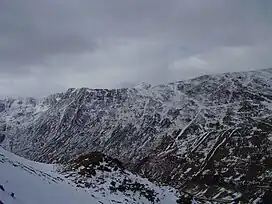 To the south of the Striding Edge–Birkhouse Moor ridge runs the long valley of Grisedale, emptying into the head of Ullswater. There are small pockets of mixed woodland on the lower slopes and above these the valley wall is steep sided with some outcropping rock.