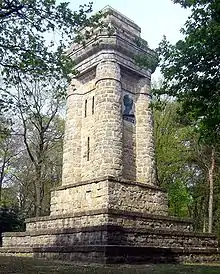 The idea for such a project did not, however, originate in Viersen. As early as 1899, the patriotic "Deutsche Studentenschaften" (German Students Association) decided to honour Bismarck as the founder of the German Empire in 1871.[1] After a competition for the design of towers or columns, they received 317 architectural plans and finally awarded the prize to the design by the Dresden architect Wilhelm Kreis called "Götterdämmerung". His work inspired many tower projects all over Germany. In Viersen, that plan was realized in 1900 in a slightly slimmer version, than the original "Götterdämmerung". It ended in a huge iron brazier on top of the building in order to light a beacon visible for miles on special occasions. The selected construction material became cuboid greywacke from the Wiehl Valley.[2]