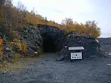 The village used to be located near the shores of the lake Bjørnevatnet, but the lake was drained in 1958 so that the iron ore under the lake could be mined.[4] During the liberation in 1944 at the end of World War II, a large number of people lived inside the mines during the fighting; estimates vary between 1,000 and 3,500.[4] Their story is portrayed in the 1974 film Under a Stone Sky.