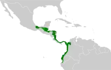 The black-cheeked woodpecker is found from Veracruz and Chiapas in southern Mexico south on the Caribbean slope into Costa Rica and from there on both slopes in Panama through western Colombia and western Ecuador slightly into Peru.[6][7][4]