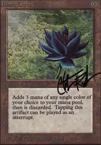 Christopher Rush illustrated the card's art.[1] Black Lotus was printed for the earliest core sets of Magic: The Gathering, the Limited Edition Alpha and Beta sets, and the Unlimited set, which were all released in 1993.[2][3] The Alpha and Beta editions had black borders, and the Unlimited edition had white borders.[4]:52 The Black Lotus is an artifact card that players can put into play for free, since it requires zero mana to cast. Players can sacrifice (discard it from play) to add three mana of one color to their mana pool.[4]:52 Since a deck may contain four copies of any non-land card, a player could have four Black Lotus cards in their deck, providing a significant advantage in the early stages of the game.[2]