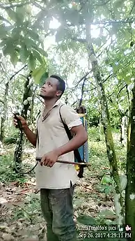 The application of copper fungicide has been shown to significantly reduce a great number of black pod incidences in Nigeria. Metalaxyl (Ridomil) and cuprous oxide (Perenox) were identified to be successful in increasing the number of harvested healthy pod compared to the application of fosetyl aluminium (Aliete) and control treatment. On top of that, the timing of fungicide application has some positive effect on the final pod yield where this plot produced greater yield than the unsprayed plot. The application was done before August, which is before the main disease epidemic that usually occurs in September and October.[8] The recommended standard for fungicide application to control black pod disease caused by P. megakarya for a season is 6 to 8 times of application in every 3–4 weeks. However, the adoption of recommended application was very low among farmers in Ghana. Therefore, an experiment with a reduced number of fungicide applications demonstrated that there was 25 to 45% reduction in disease incidence.[7] In terms of disease control and yields, sanitation and three applications of Ridomil 72 plus (12% metalaxyl + 60% copper-1-oxide) fungicide showed a better control compared to sanitation alone and sanitation with one or two fungicide applications. However, reduced in fungicide application was shown to be significantly less effective than the recommended standard fungicide application. It was suggested that the understanding regarding the source of inoculum, the amount of infective inoculum production and how the disease is disseminated is important in order to identify the appropriate and economical method in fungicide application as well as for an effective control of the disease. For example, the application of fungicide on the trunk will help farmers to control the spread of the disease up in the canopy, as it is difficult to reach the canopy during fungicide application. This will eventually save more time, labor and cost for disease management.[7]
