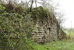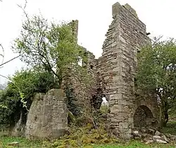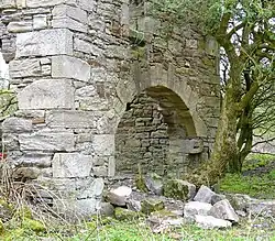 The ruins of a fairly substantial and basically U-shaped building, probably once a farm, survives at Blacksyke, located close by and slightly to the south-east of the tower and once connected by a lane to the nearby Ayr Road. An attached building is recorded on the 1896 OS maps as a school for the children of the colliers, estate workers, etc.[15] and in 1908[16] it is shown as a Sunday School as by this time the local pits had closed. The OS Name Book of 1855-57 records that the old farm was occupied by labourers employed by the then proprietor Thomas Smith Cunningham Esq. of Caprington Castle.[17]