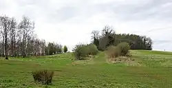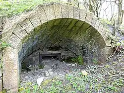 The twin lime kiln is shown on the first 1860 OS map, but was disused and the wagonways lifted by the time of the OS Second Edition map of 1897.[2] An inclined embankment runs up to the top of the lime kilns up which wagons would have carried coal and limestone to charge the kilns. The kiln eyes are still in good condition and unusually the rectangular iron box and grate bars from which the quicklime was removed, a hazardous procedure, especially in wet weather. A railway line ran to the north-west and north-east so that the lime kiln sat in a V-shaped area between them.[12]