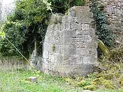The engine house ruins show that a considerable amount of attention to detail was undertaken to build the tower house with an authentic appearance, although the walls are not unduly thick, with a reportedly vaulted ground level, a water spout; randomly placed windows; a corbelled parapet on the east and south side; crow-stepped gables and on the north-east a turret that was once a chimney as evidenced by soot within and two access flue, one from within the main building. The four walls of this rectangular structure (6.0 by 8.0m and only 0.7m thick) were rubble-built and the corners have dressed stone quoins.[7] The south-facing gable end has a crow-step feature which is slightly offset from the main wall and has the roof angle trace marked upon it. The stone type and quality of the crow-step feature and the side building to the west suggest that they were later structures and that the castle-features were a later addition to a previously normal engine house. The iron supports for a drainpipe are located on the south-facing gable end.