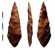 The most extensive and well-documented sample of so-called Still Bay points in southern Africa comes from the Still Bay sequence in the Blombos Cave.[18][19][21] Still Bay points are the fossiles directeurs of the Still Bay techno-complex, and they conform to bifacially worked stone points, popularly referred to as "lance-heads", "laurel leaf-shaped" or "willow leaf-shaped" stone points.[37][38] Still Bay points have bifacially retouched sides, are elliptic to lanceolate shaped and most often they have two pointed apices.