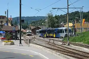 Blonay railway station (French: Gare de Blonay) is a railway station in the municipality of Blonay, in the Swiss canton of Vaud. It is located at the junction of the 1,000 mm (3 ft 3+38 in) metre gauge Vevey–Les Pléiades and Blonay–Chamby railway lines. Both are owned by Transports Montreux–Vevey–Riviera, although the latter is operated as a heritage railway by the Blonay–Chamby Museum Railway.[1]