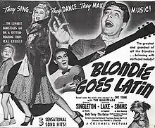 Blondie Goes Latin, also known as Conga Swing, is a 1941 American comedy film directed by Frank R. Strayer and Robert Sparks and starring Penny Singleton, Arthur Lake, and Larry Simms. It is the eighth of the Blondie films.[1] The film showcases musical numbers of Kirby Grant, Ruth Terry, Tito Guizar, with Arthur Lake displaying his drum skills, Penny Singleton her singing and dancing prowess.[2][3]
