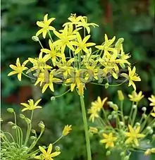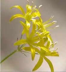 Bloomeria crocea var. aurea, with the common name golden stars, is a variety of Bloomeria that is endemic to California. When blooming in late spring, its bright colors are distinctive.