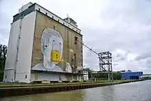 In 2010, Blu was invited to Vienna to paint a mural at the Danube River harbour near Albern in the city district of Simmering. First suggested in 1923 as one possibility for the expansion of Vienna's harbour facilities, Albern was selected for realisation by the German Reich Ministry of Transport (Reichsverkehrsministerium) in 1939, a year after the "Anschluss" of Austria to Nazi Germany. The project was to serve as a logistic node of a future geo- and biopolitical order, designated for the transshipment of grain from the annexed or economically colonized regions of eastern and south-eastern Europe to the heartlands of the German Reich. For the construction of the harbour basin and its five granaries between 1939 and 1942, the Nazi regime employed forced labour. Realized on one of the granaries, Blu's mural called upon the overdue historical and social commemoration of the place's charged history and the unknown fates of the forced labourers who built it. The commissioned piece was destroyed in autumn 2013 in the course of renovation works.[12][13]