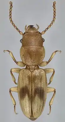 Blubos is a genus of beetles in the family Laemophloeidae. The only known species in the genus is Blubos matris, a large (4 mm) yellowish beetle with darkly fasciate elytra. It differs from all other known laemophloeids in that the lateral margins of the pronotum are visible in dorsal view.[1] It is known from a single specimen collected more than 60 years ago in the Democratic Republic of the Congo. Nothing is known of its biology or immature stages.