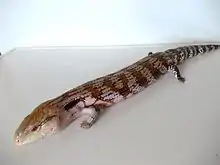 Blue-tongued skinks[2] comprise the Australasian genus Tiliqua, which contains some of the largest members of the skink family (Scincidae). They are commonly called blue-tongued lizards or simply blue-tongues or blueys in Australia or panana in Indonesia. As suggested by these common names, a prominent characteristic of the genus is a large blue tongue that can be bared as bluff-warning to potential enemies.[3] The type of predator/threat that is near will determine the intensity of colour present in the tongue. The tongue can also deform itself and produce a thick mucus in order to catch prey.[4] They are relatively shy in comparison with other lizards, and also significantly slower due to their shorter legs.