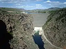 Blue Mesa Dam is a 390-foot-tall (120 m) zoned earthfill dam on the Gunnison River in Colorado. It creates Blue Mesa Reservoir, and is within Curecanti National Recreation Area just before the river enters the Black Canyon of the Gunnison. The dam is upstream of the Morrow Point Dam. Blue Mesa Dam and reservoir are part of the Bureau of Reclamation's Wayne N. Aspinall Unit of the Colorado River Storage Project, which retains the waters of the Colorado River and its tributaries for agricultural and municipal use in the American Southwest.[1][2] Although the dam does produce hydroelectric power, its primary purpose is water storage.[3] State Highway 92 passes over the top of the dam. Blue Mesa Dam houses two turbine generators and produces an average of 264,329,000 kilowatt-hours each year.[4]