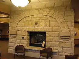 Kansas State University moved from the location of old Blue Mont Central College in 1875, and the original college building was torn down in 1883. Nevertheless, Kansas State University has honored its legacy by naming a building on its present campus Bluemont Hall, by featuring an arch from the original Blue Mont Central College building over the central fireplace in the KSU Alumni Center, and by displaying the college's old bell on campus.[9][10]