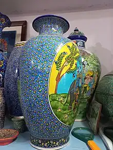 Blue Pottery is widely recognized as a traditional craft of Jaipur of Central Asian origin.[1] The name 'blue pottery' comes from the eye-catching cobalt blue dye used to color the pottery. It is one of many Eurasian types of blue and white pottery, and related in the shapes and decoration to Islamic pottery and, more distantly, Chinese pottery.
