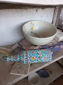 Being fired at very low temperature makes them fragile. The range of items is primarily decorative, such as ashtrays, vases, coasters, small bowls and boxes for trinkets. The colour palette is restricted to blue derived from the cobalt oxide, green from the copper oxide and white, though other non-conventional colours, such as yellow and brown are sometimes included.[5] The products made include plates, flower vases, soap dishes, surahis (small pitcher), trays, coasters, fruit bowls, door knobs, and glazed tiles with hand painted floral designs. Sometimes, designer pieces for display are also made. The craft is found mainly in Jaipur, but also in Sanganer, Mahalan, and Neota.[6]
