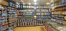 Jaipur blue pottery, made out of ceramic frit material similar to Egyptian faience, is glazed and low-fired. No clay is used: the 'dough' for the pottery is prepared by mixing quartz stone powder, powdered glass, Multani Mitti (Fuller's Earth), borax, gum and water.[1] Another source cites Katira Gond powder (a gum), and saaji (soda bicarbonate) as ingredients.[3] Like pottery it is fired only once. The biggest advantage is that blue pottery does not develop any cracks, and blue pottery is also impervious, hygienic, and suitable for daily use. Blue pottery is beautifully decorated with the brush when the pot is rotated.[4] Thus it has great utilitarian as well as aesthetic significance.