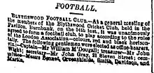 In 1880, some of the club members founded a junior offshoot which became a founder member of the Scottish Junior Football Association,[7] and Blythswood played in the inaugural Scottish Junior Cup that season; although the club beat Luton 1–0 in the first round,[8] a protest saw a replay being ordered,[9] and the club eventually lost in a second replay.[10] The last recorded game Blythswood game was a 9–0 defeat to the Hawthorne club in 1882;[11] a game against Glenburn scheduled for the next month does not seem to have taken place.[12]