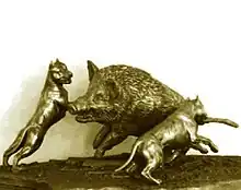 A bronze sculpture from the early 1900s, depicting two "catch dogs" working a wild boar.