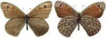 "The nomotypical parmenio Boeb. (35 d) occurs in the mountains of Siberia, especially in the Altai and Amurland, as well as in Mongolia and Manchuria. The ground-colour of the hindwing above is somewhat lighter than in [Erebia] afer; the costal margin and sometimes the apex being dusted with grey. The band of the forewing consists of 4 rounded russet-yellow spots with black white-centred spots. The 2 upper ones are confluent, forming a large black spot which bears 2 white dots. The hindwing has 3—4, more rarely 5, russet -yellow spots with black white-centred ocelli. The forewing red-brown beneath, the costal margin, apex, and a portion of the distal margin dusted with silvery grey, the double ocellus narrowly ringed with yellow. The other ocelli are very small, being often partly or all absent. The underside of the hindwing grey-brown, finely dusted with white-grey, especially towards the base. All the veins are shaded with grey and contrast strongly with the ground-colour. The distally dentate median band is bordered by a band-like silver-grey arched line. The distal margin is edged with a grey line, and proximally to this there is a narrow dentate brown band which is divided by the veins. The submarginal ocelli encircled with pale yellow. The female differs above but little from the male; the grey dusting at the apex of the forewing extends in many specimens to near the cell, especially on the underside, where the veins are also silvery. The butterflies flutter on dry and stony places slowly and low above the boulders, the forewing being moved in a different plane as the hindwing; Elwes, who saw all forms of parmenio alive, did not find this kind of flight in any other butterfly. On the wing in July, settling on grass. The species occurs in large numbers in its flight-places, whole swarms rising from before the feet of the observer.[1]
