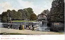 The Bois de la Cambre was laid out starting in 1861 by Édouard Keilig, a German architect. His project, relating to English landscaping, was characterised by an irregularity in the plantations and roads, by alternating massifs and clearances allowing beautiful visual escapes, and by the creation of picturesque scenes. The park, property of the Belgian State since 1843, was granted through a royal decree issued on 21 April 1864 to the City of Brussels, which is responsible for its development and maintenance.[6] In 1863, the two neoclassical former toll pavilions of the Namur Gate by the architect Auguste Payen from 1836 were moved to the entrance of the Bois de la Cambre.[7] In 1866, the park, largely landscaped, was open to the public and aroused considerable enthusiasm.