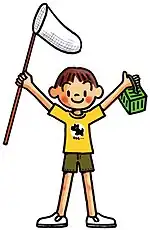 The game's character designs are created by illustrator Mineko Ueda.[15] Ueda's figures in both Boku no Natsuyasumi and her commercial work are characterized by their simple and cartoonish designs, with rounded features and dot eyes.[6][15] The artist stated that she was instructed to make the characters look like average people, commenting that the only design she made that was revised from its first pass was that of an aged hippie with long hair and a bandana; while Ueda said that she intended the design to evoke the game's 1970s setting, the developers told her to make the character look more "ordinary".[16] Ayabe stated that he sought Ueda's participation in Boku no Natsuyasumi because he felt that a game set in historic rural Japan "for better or worse, could have been very 'Japanese' in style", and that he was drawn to Ueda's art style as it does not "have an overly 'Japanese' flavor".[7]