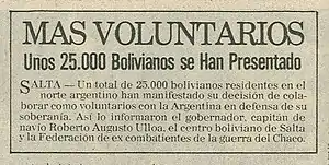 Although the Bolivian government had adopted a neutral position in the face of the conflict, the same had not happened with Bolivian society, since on May 26, 1982, the governor of the Province of Salta, Roberto Augusto Ulloa, together with the Bolivian Center of Salta and the Federation of Bolivian Ex-combatants of the Chaco War (1932-1935) announced to the Argentine press that at that time there were at least 25,000 Bolivian citizens who were willing to go to the battlefront, all offering themselves as volunteers. to defend the Malvinas Islands by repelling the English invasion.[1]