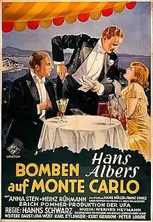 Bombs on Monte Carlo (German: Bomben auf Monte Carlo) is a 1931 German musical comedy film directed by Hanns Schwarz and starring Hans Albers, Anna Sten, and Heinz Rühmann.[1] The film is based on the novel Bomben auf Monte Carlo (1930) by Fritz Reck-Malleczewen. It premiered at the Ufa-Palast am Zoo in August 1931.
