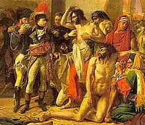 The painting was also commissioned in part to counter reports of French atrocities during their capture of Jaffa. After two French messengers sent to parley with the Ottomans had been killed and their heads displayed on the city walls, Napoleon promised the troops under his command two days and nights to plunder the city. After the city capitulated on the fourth day, the French brutally sacked the city, "slaughtering Christians, Jews and Muslims indiscriminately." Napoleon also ordered the mass killing of 3,000 Ottoman prisoners in French captivity.[3] News of such atrocities contradicted the French justification for their invasions of Ottoman-held Egypt and Syria, namely that it was a mission civilisatrice "that would bring enlightenment to the benighted lands of the East." The painting "thus had a very specific propagandist function."[4]