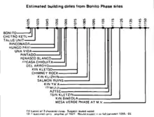 Bonito Phase is an archeological term that refers to the period between 900 and 1140 CE, during which the Ancestral Puebloans in the Chaco Canyon area constructed numerous great houses. The system is divided into three parts: the Early Bonito phase from 900 to 1040; the Classic Bonito phase from 1040 to 1100, and the Late Bonito phase from 1100 to 1140. When the system was created in the 1980s, it was thought that construction at Pueblo Bonito began around 920, but it is now known that building at the great house started almost one hundred years earlier, c. 850.[1]