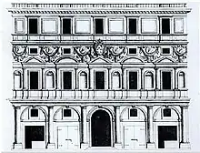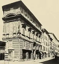 Between the west side of piazza Scossacavalli and the south side of Borgo Nuovo, the Caprini family from Viterbo let erect by Bramante their Roman residence.[15] The palace was then bought by Raphael, who completed it and spent there the last 3 years of his life, dying there in 1520.[46] Later, the building was enlarged, becoming the Palazzo dei Convertendi. Along Borgo Nuovo the palace had a monumental portal surmounted by a balcony, both designed by Baldassarre Peruzzi; the latter was considered the most beautiful in the whole city.[47][48] The Palazzo dei Convertendi was demolished in 1937 and rebuilt in 1941 west of Palazzo Torlonia with another plan but reusing original elements, included the portal with the balcony.[49]