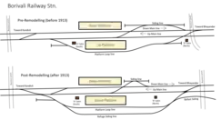 Before and after diagrams of Borivali railway station, showing changes in layout after the remodeling scheme of 1913